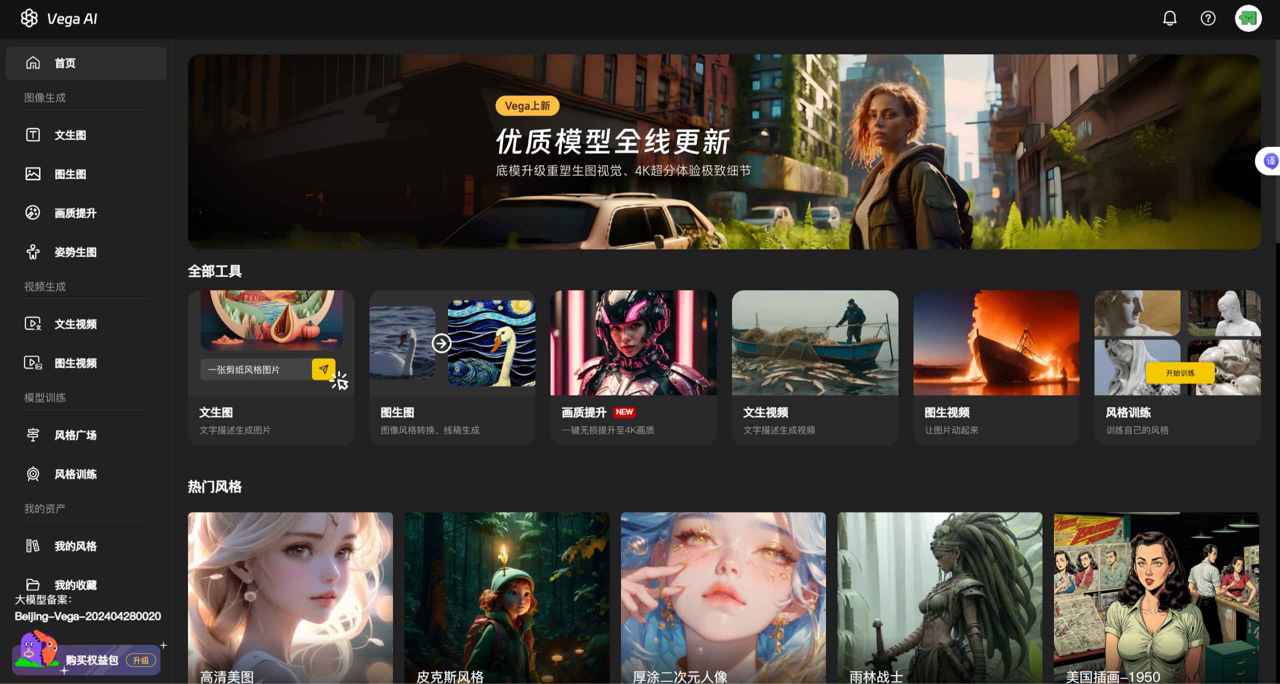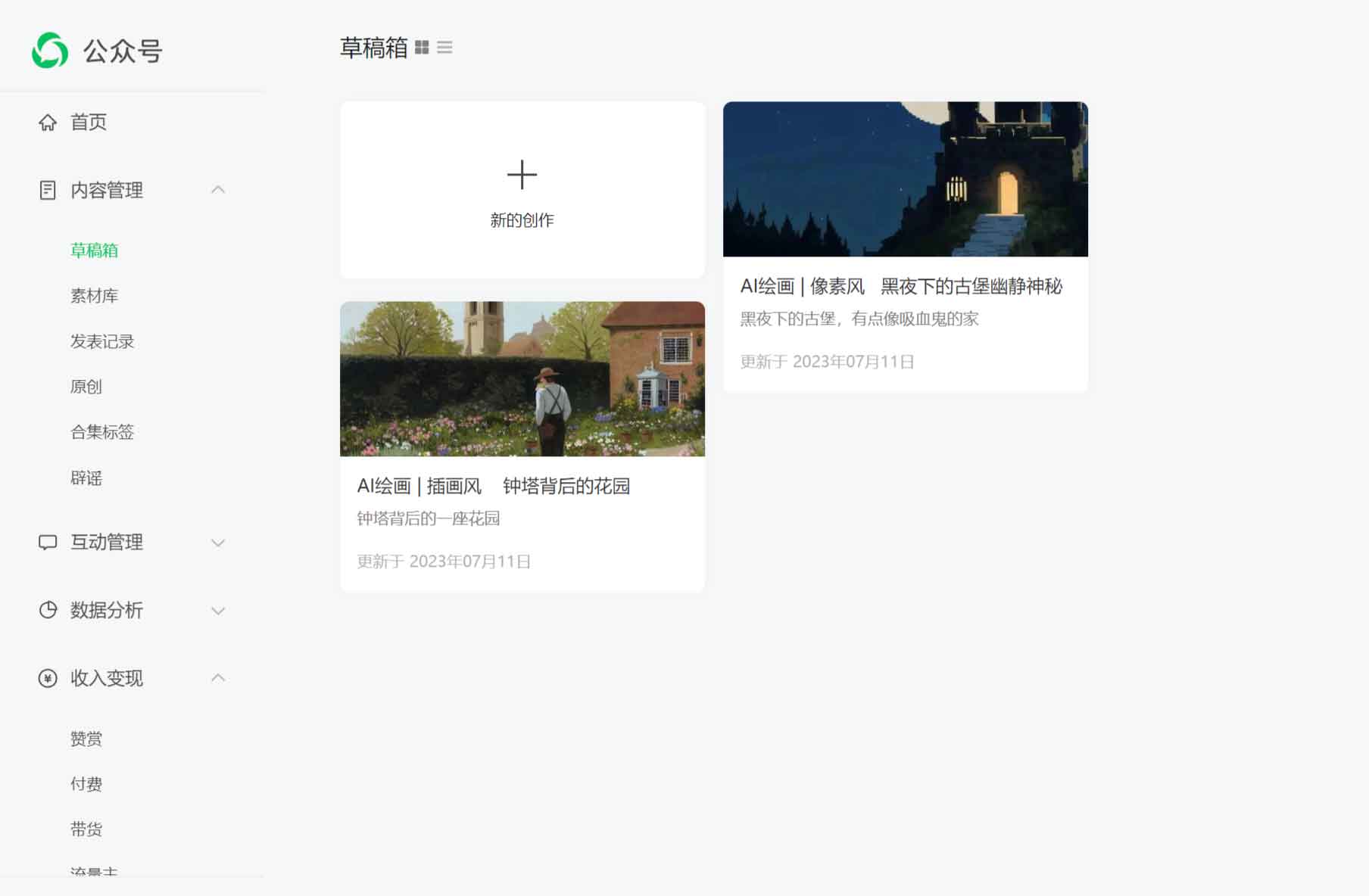 那时AI概念很火,我不知从哪篇文章中看到AI绘画这方向有前景。于是,我将公众号取名为“AI绘画吧”,利用这个AI绘画工具——Vega AI(https://applet.rightbrainai.cn/)生成一些我觉得很有意境的插画图片并放到公众号上面,结果是那当然没人看。